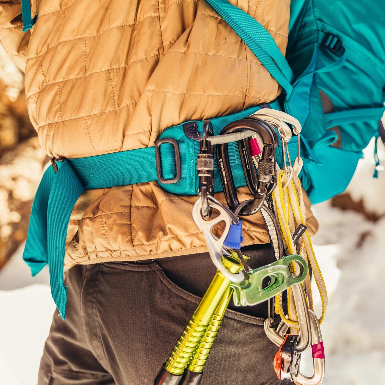Harness and hip belt are designed to work while wearing a climbing harness.