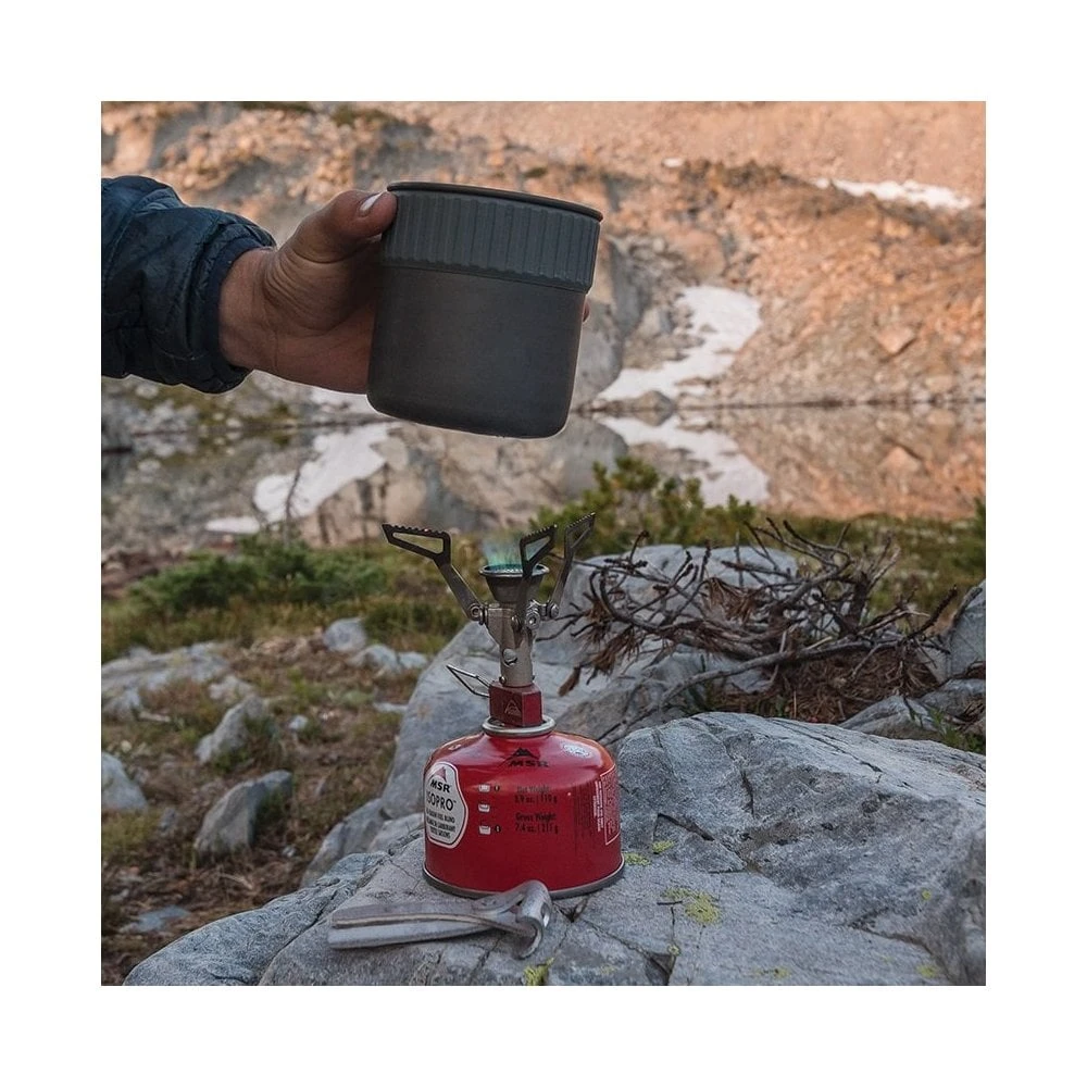 The size of a large mug, the MSR Trail Mini Solo Cook Set delivers the essentials you need to fuel up—all in a cook kit that’s ridiculously small in your pack. Perfectly sized to make hot water for one pouch meal or a generous cup of coffee, its pot plays double duty as your eat-and-drink vessel. Inside, it nests a PocketRocket® 2 stove and 4 oz. MSR fuel canister. Outside, its bowl efficiently adds a second vessel, making this the ultimate space-maximizing cook set for solo minimalists moving fast with a small pack.