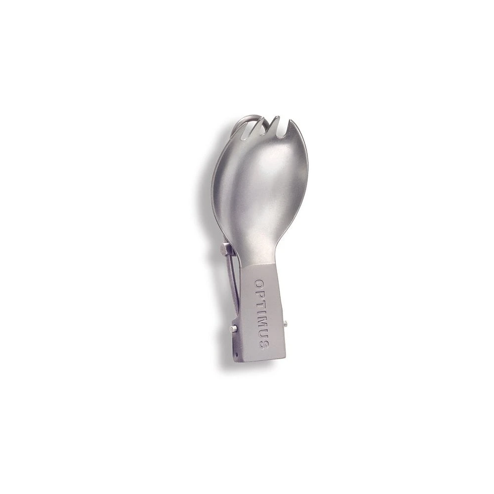 Lightweight Optimus Titanium Alloy folding spork has a Matte finish handle with a polished eating surface and a positive lock-out position.