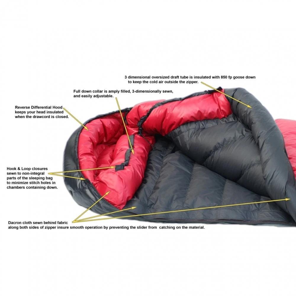 Differential cuts: Some manufacturers use one template or ‘pattern’ for the inner and outer of their bags (lining and shell). This saves on production costs, but the bag will lose performance and you will feel the cold anywhere your body presses against the inside of the bag. This is because the down between the two fabrics is crushed and down that isn’t lofted isn’t fulfilling its potential of trapping air to keep you warm.